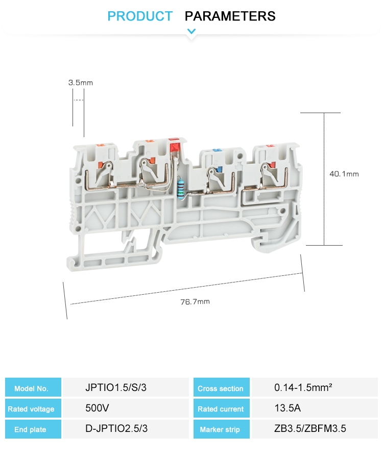 Клемная калодка JPTIO1.5/S/3-LED(24V) Клемная калодка выкарыстоўвае вогнеахоўны нейлон PA66, латуневы правадыр і спружыну сціску з нержавеючай сталі для забеспячэння электрычнай бяспекі і механічнай трываласці ў цяжкіх умовах працы.