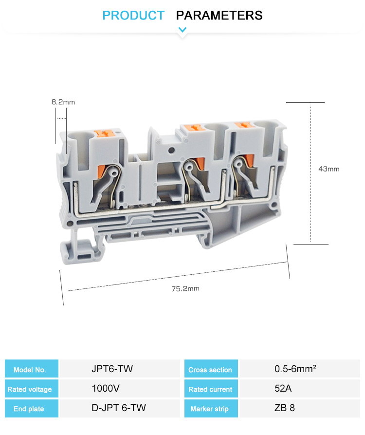 Серыя PT16-TWUT SICE-INCINT BUCKLICE Multi-Conductor Block рэвалюцыянізуе электрычнае злучэнне: цвёрдае злучэнне можа быць дасягнута пры лёгкім выцягванні дроту, што пазбавіла клопатаў ад зачысткі і скручвання дроту. Дызайн без шрубы вясновага заціску выключае працаёмкую ўстаноўку і рызыку разрыхлення, а спружынны механізм забяспечвае доўгатэрміновую надзейную праводнасць. Шматлікая сеткавая адначасовая сувязь з высокай шчыльнасцю адаптуецца да складаных сцэнарыяў і аптымізуе прастору кабінетаў прамысловага кіравання і камерцыйных электрычных сістэм. Ён працуе выключна добра ў такіх сцэнарыях, як павышэнне эфектыўнасці праводкі прамысловага абсталявання, кампактную ўстаноўку ў гандлёвых памяшканнях і памяншэнне прастою падчас тэхнічнага абслугоўвання. Гэта эфектыўны і надзейны выбар для інжынераў і мантажнікаў.