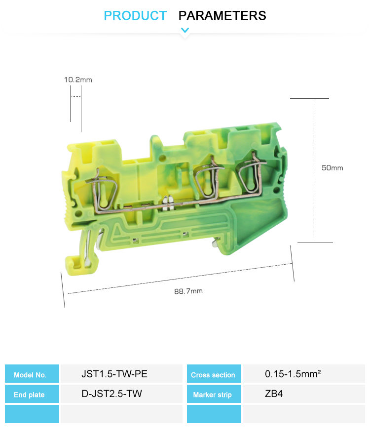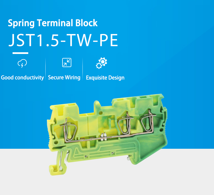 Блок зазямлення ST1.5-TW-PE Spring Type Free зазямляецца, прымае інавацыйны дызайн спружыннага кліпа, падтрымліваючы хуткую ўстаноўку без інструментаў 1,5-міліметровага правадоў і забяспечвае стабільнае сейсмічнае зазямленне. Кампактная круглая структура павышае механічную стабільнасць і падыходзіць для ахоўнага зазямлення прамысловага абсталявання, будынкаў і жылых сістэм. У параўнанні з традыцыйнымі шрубавымі тэрміналамі, ён значна скарачае час усталявання і лёгка падтрымліваць, забяспечваючы электрычную бяспеку з надзейнай працаздольнасцю і задавальняючы сучасныя патрэбы ў розных зазямленнях розных сцэнарыяў