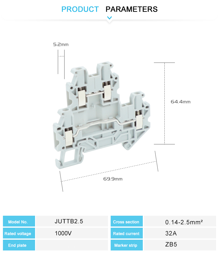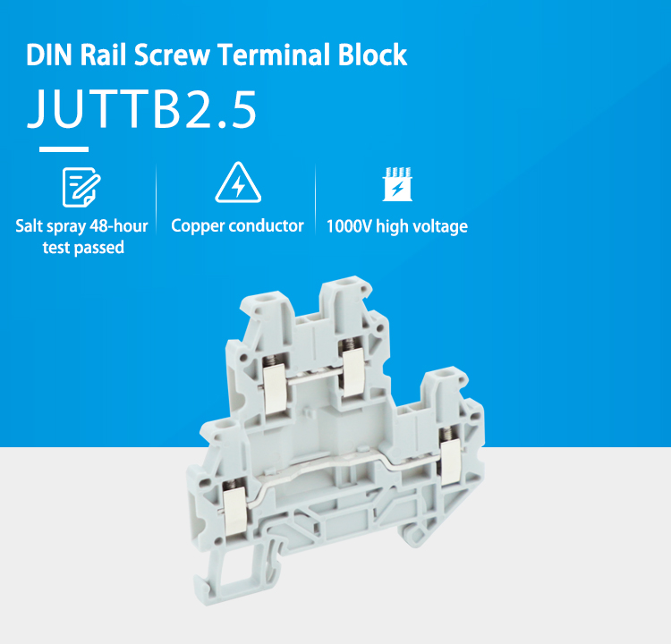 Блок шрубавага тэрмінала UTTB2.5 з двухступеннай стадыі спецыяльна распрацаваны для эфектыўных і бяспечных электрычных злучэнняў у прамысловых і камерцыйных умовах. З ёмістасцю 2,5 мм² ён падыходзіць для сцэнарыяў нізкага і сярэдняга току. Рэйка DIN лёгка ўсталяваць, а двухступенная структура эканоміць прастору. Шрубавае злучэнне з'яўляецца анты-вібрацыяй і герметычным, сумяшчальным з фіксаванымі/скручанымі меднымі правадамі. Якасныя матэрыялы, якія ўваходзяць у полымя, з'яўляюцца ўстойлівымі да цяпла і ўстойлівасці да ўздзеяння, адпавядаюць галіновым стандартам. Яны падыходзяць для кантрольных шаф, сістэм размеркавання электраэнергіі і г.д., забяспечваючы надзейныя рашэнні для злучэння.